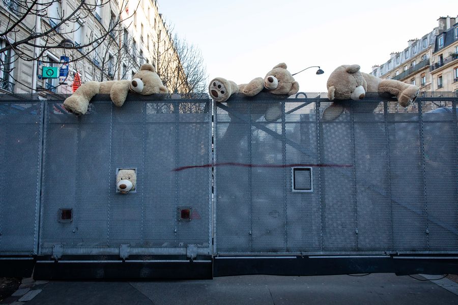 Huge teddy bears are seen during the demonstration in Paris, France, Jan. 16, 2019. (Photo by Aurelien Morissard/Xinhua)