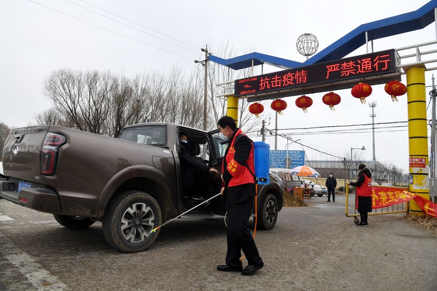 A man disinfects a vehicle at an entrance to Qianzhangjiazhuang Village in Jiangshan Town of Laixi City, east China's Shandong Province, Jan. 28, 2020. (Xinhua/Li Ziheng)