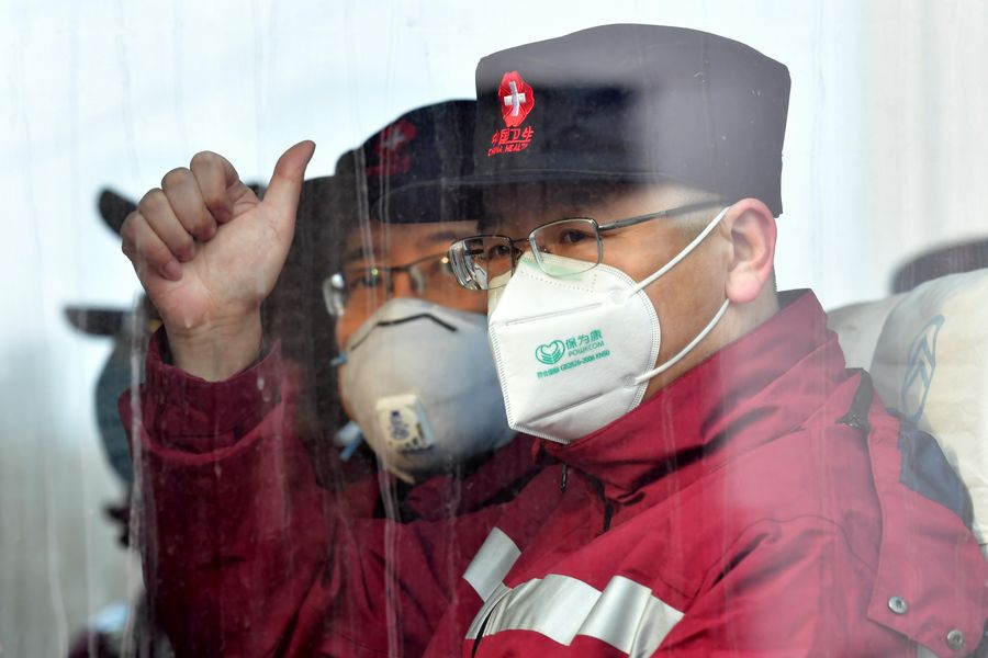 Medical team members say goodbye on a bus heading for the train station in Taiyuan, north China's Shanxi Province, Feb. 5, 2020. (Xinhua/Cao Yang)