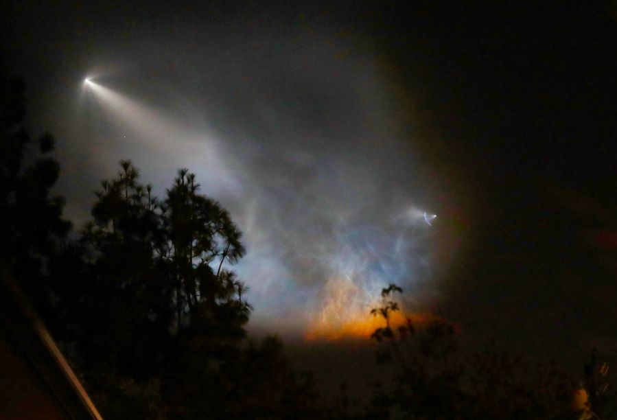 A SpaceX Falcon 9 rocket lights up the sky over Los Angeles, California, the United States, on Oct. 7, 2018. U.S. (Xinhua/Li Ying)