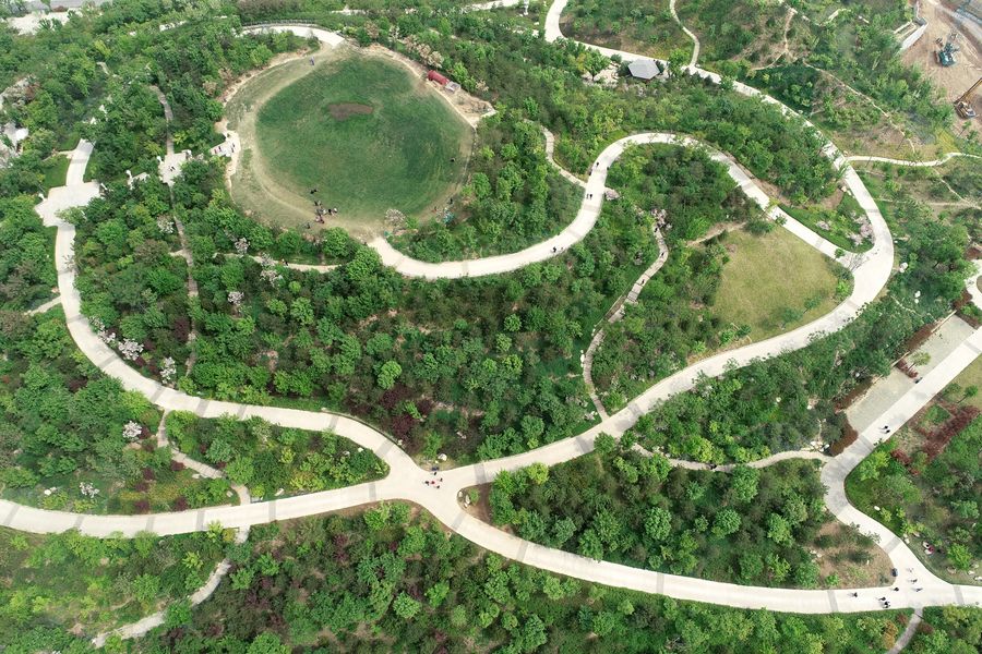 Aerial photo taken on April 22, 2020 shows Chang'an Park in Xi'an, northwest China's Shaanxi Province. In recent years, Xi'an has continued improving the quality of the ecological environment by means of new green space parks and comprehensive treatment of water bodies. (Xinhua/Zhang Bowen)