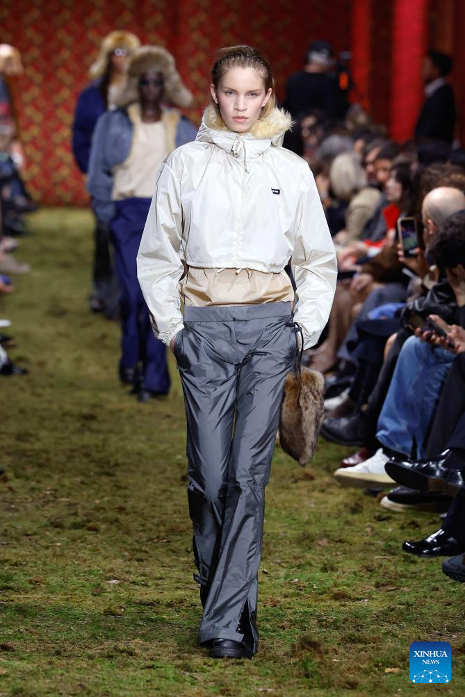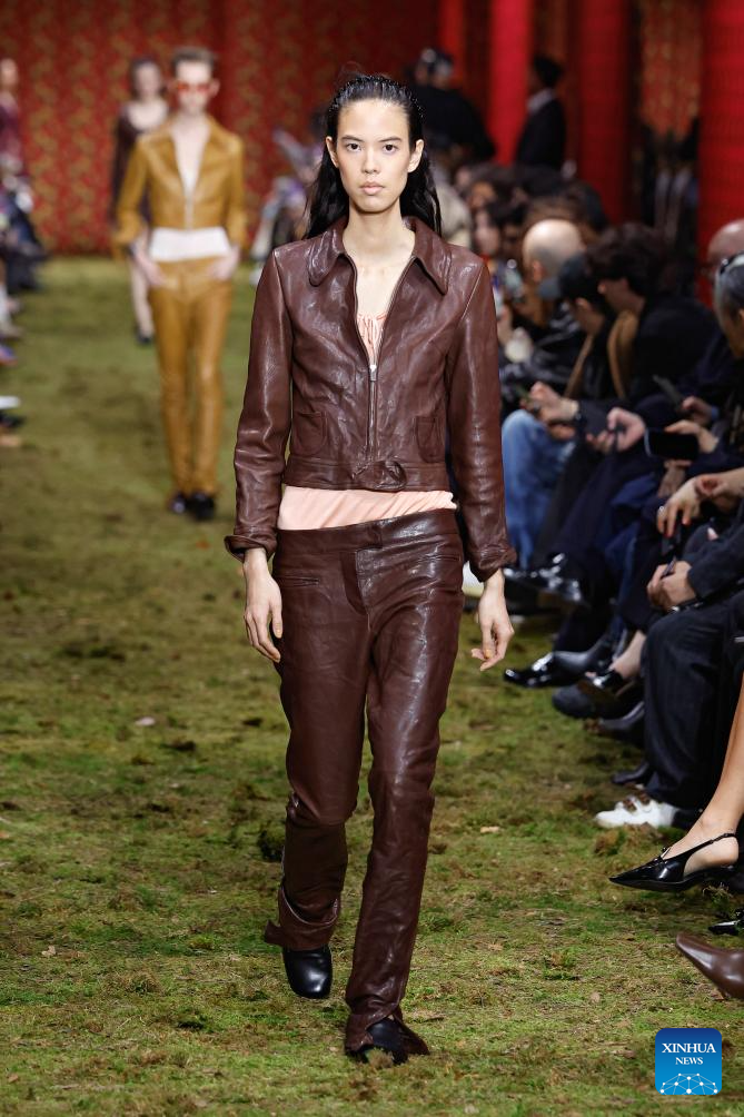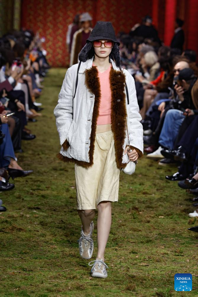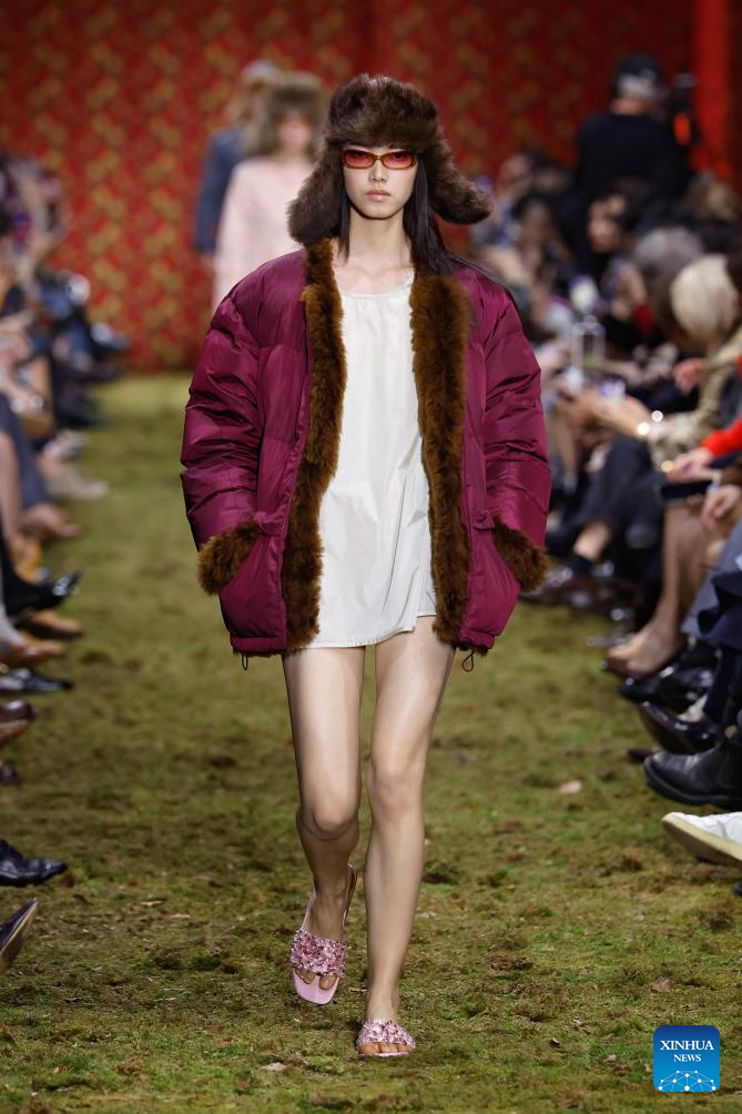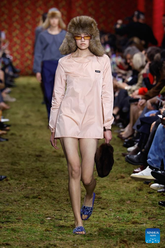 A model presents a creation from the Ready-to-Wear Fall/Winter 2026-2027 collections by Miu Miu during the Paris Fashion Week, in Paris, France, on March 10, 2026. (MeetEurope/Handout via Xinhua)