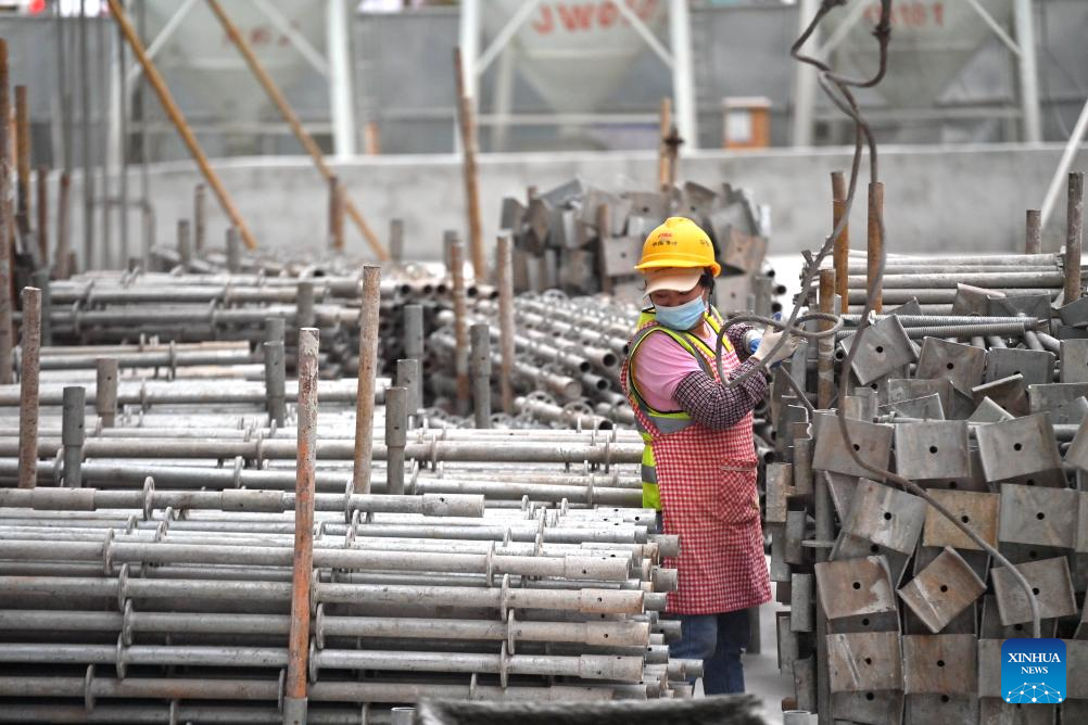 A worker carries materials at the construction site of an urban village renovation project in Nanning City, south China's Guangxi Zhuang Autonomous Region, March 16, 2026. The urban village renovation project is a key project promoted by the local government, which has been progressing smoothly. It is expected that the new houses of the project can be delivered to the residents by the end of October this year. (Xinhua/Huang Xiaobang)