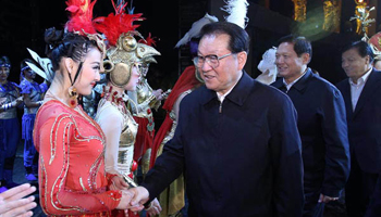 Senior official watches Chinese opera "Golden Mask Dynasty" in Beijing