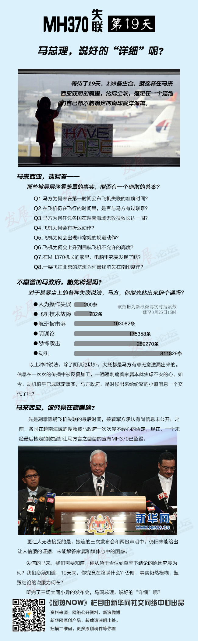 等待了19天,239條生命,就這樣在馬來西亞政府的嘴里,化成塵埃,落定在一個連他們自己都不能確定的南印度洋海域。事實仍然模糊,結(jié)論的說服力何在?馬國總理,你說好的“詳細(xì)”呢?