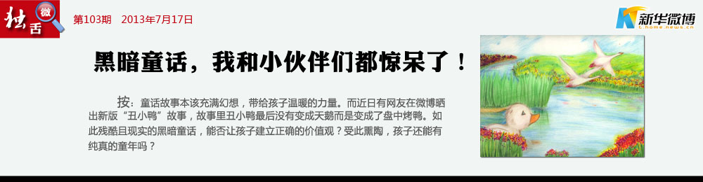 【黑暗童話也有正能量】 兒童閱讀黑暗童話——丑小鴨變烤鴨并不可怕,這是一種挫折教育。孩子的成長(zhǎng)需要適度的挫折教育。一直活在象牙塔里的孩子,在走入社會(huì)之后很難適應(yīng)現(xiàn)實(shí)的生活,他們常常因?yàn)閷W(xué)業(yè)或工作中的一點(diǎn)挫折而走向極端。因此,在其進(jìn)入社會(huì)之前進(jìn)行適度的挫折教育必不可少。