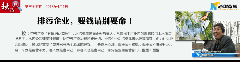 【紙水澆麥田 記者:你們敢吃嗎?村民:都賣給你們了!】 河南新鄉(xiāng)鳳泉區(qū)大塊鄉(xiāng),村民都用造紙廠的 污水澆灌麥田,被央視曝光。村民說,打井抽不出水,只能用工廠污水澆田。記者問:這水澆出的麥子 你們敢吃?村民的回答很直接:都賣給你們了,我們自己不吃。