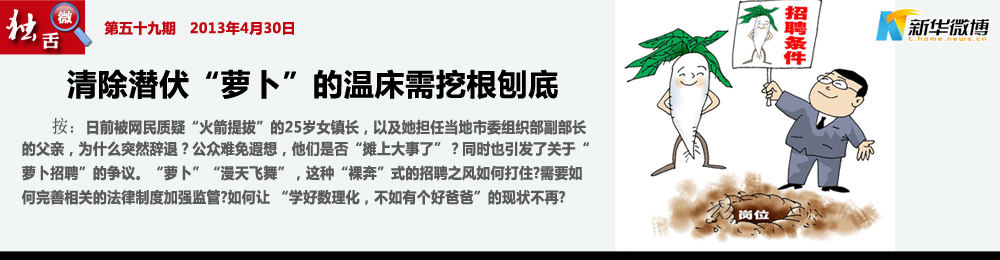 拔“蘿卜”更需祛“污泥” 對曝光的類似事件不能僅僅停留在“補改撤銷”的層面,更多的是對?!疤貦唷薄⒋颉坝H情牌”、用公權辦私事者的嚴格問責,杜絕補改、撤銷招聘淪為一些人的免責“擋箭牌”,發(fā)現(xiàn)一起、查處一起。