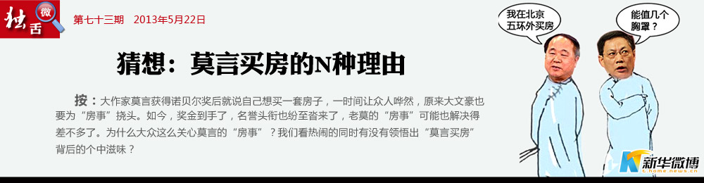 猜想四:生活方便才能工作方便 獲得諾獎了,拿到獎金了;當(dāng)上主任了,有了編制了;演講變多了,交際頻繁了……為了以后工作便利,支持莫言老師在宇宙中心購房,希望莫言老師再創(chuàng)佳績。