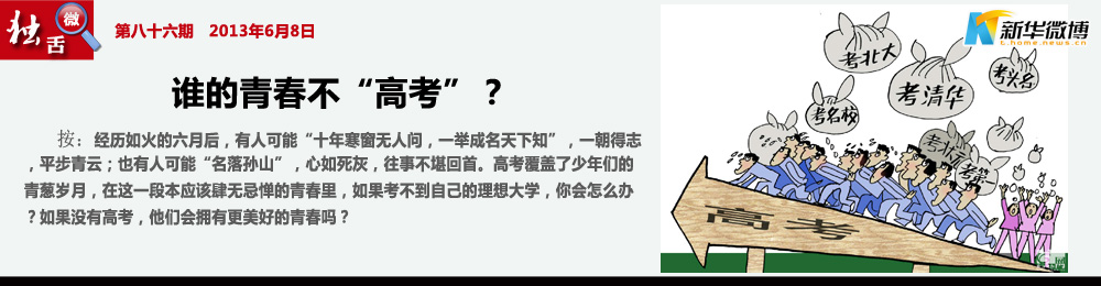 【為經(jīng)濟(jì)做貢獻(xiàn)】 算算高考,用了12年青春,至少四五十萬(wàn)的學(xué)費(fèi),我們養(yǎng)活了晨光廠、真彩廠、機(jī)讀卡廠、無數(shù)造紙廠、無數(shù)印刷場(chǎng),翰林書店、新華書店,城市的交通行業(yè),學(xué)校周邊的飯館,以及所有老師的工資獎(jiǎng)金、校長(zhǎng)的車、油錢……高考是國(guó)家支柱型民營(yíng)企業(yè)!這就是我們的功勞!