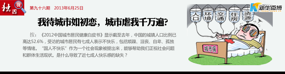城市病了 光污染、空氣污染、噪音污染、熱島效應、食品安全、交通障礙、高空拋物、樓宇消防電梯……吸的是霧霾,吃的是不放心食品,高起的物價,昂貴的醫(yī)療,上學難,就業(yè)難,國人能健康嗎?能快樂嗎?