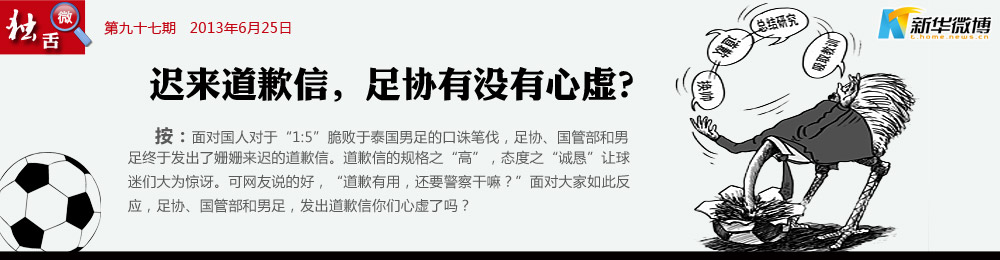 央視也不能忍了 “這樣的檢查沒有觸及靈魂,應(yīng)該打回去重寫?!薄胍曉u足協(xié)道歉。足協(xié)、國管、國足上演道歉信帽子戲法,怎么看怎么像兒戲,別說觸及靈魂了,純屬耍嘴皮子。