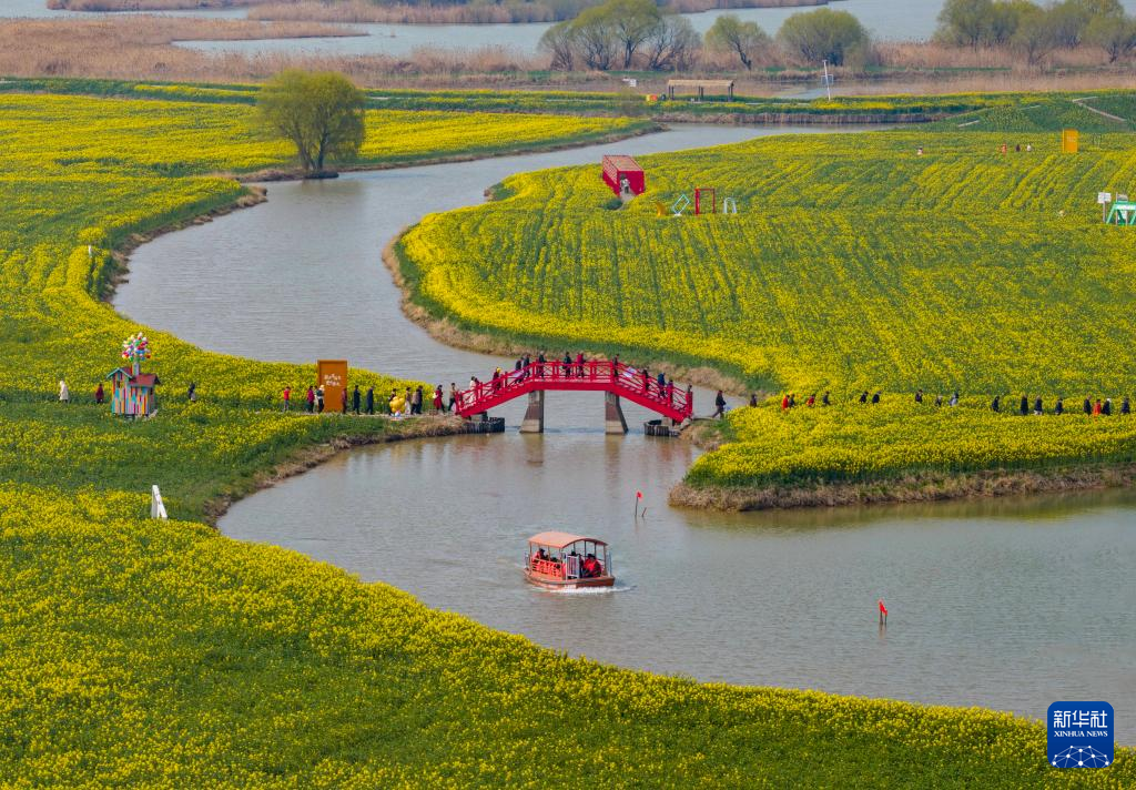 3月12日,游客在江苏省高邮市湖上花海景区赏花游玩(无人机照片)。