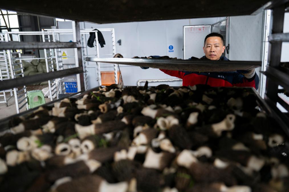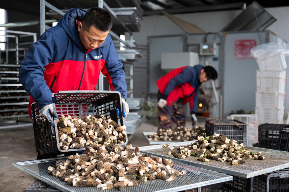 3月15日,在位于远安县旧县镇的宜昌市润生农业有限公司,工作人员在摊铺新鲜羊肚菌。