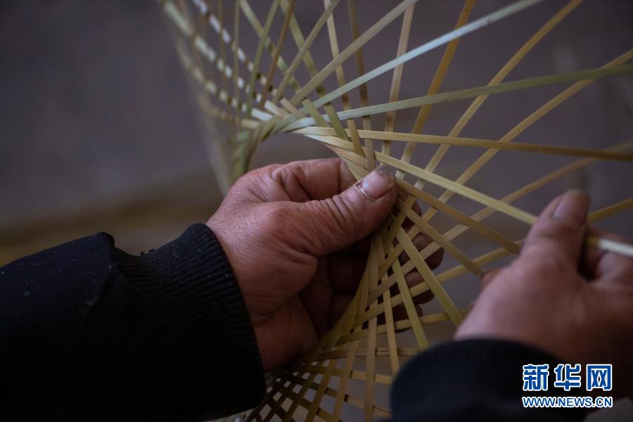 云南省會(huì)澤縣大一學(xué)生王淼的父親王玉榮在家中編竹編(2月6日)。新華社記者 林碧鋒 攝