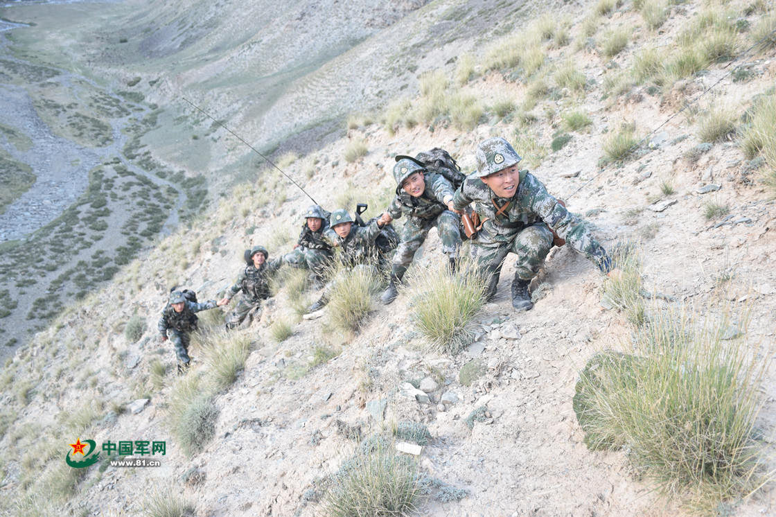 在高達(dá)60多度的陡坡上,新戰(zhàn)士手拉手,分批次翻越窮鐵列克達(dá)坂。嚴(yán)曉春攝