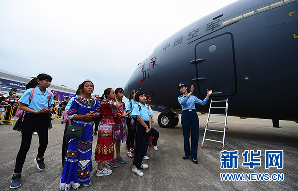 藍(lán)天春蕾女童在航展現(xiàn)場(chǎng)參觀(11月10日攝)。 新華社發(fā)(陳藝 攝)