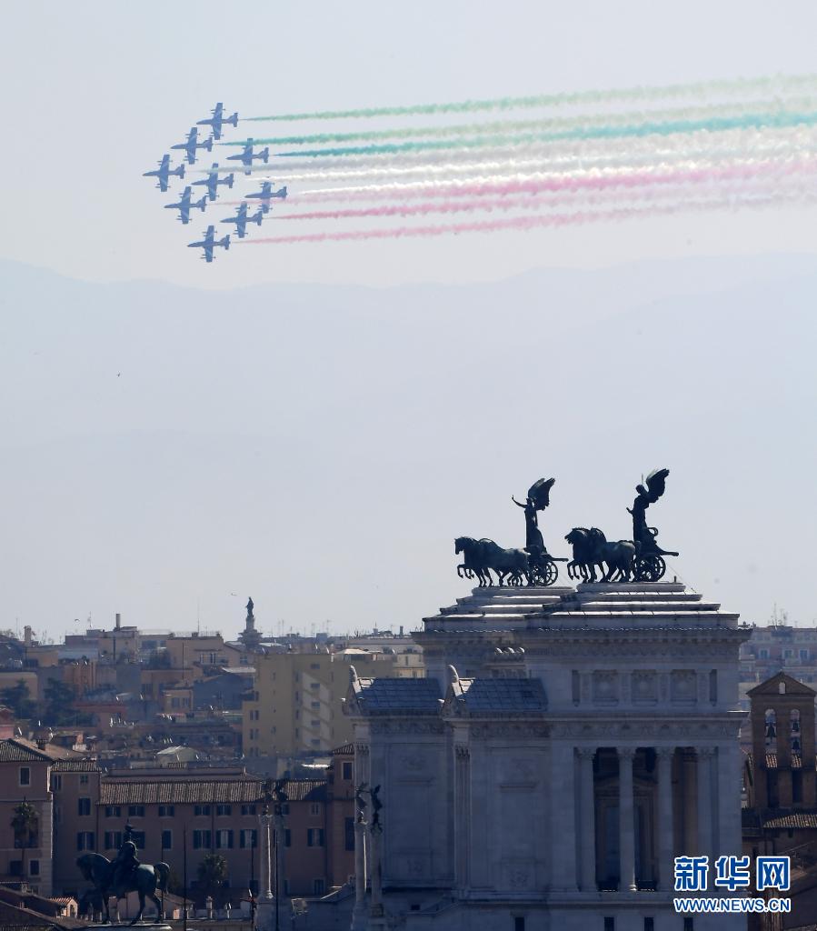 3月30日,意大利“三色箭”飛行表演隊從羅馬上空飛過,留下代表意大利國旗顏色的三色彩煙。