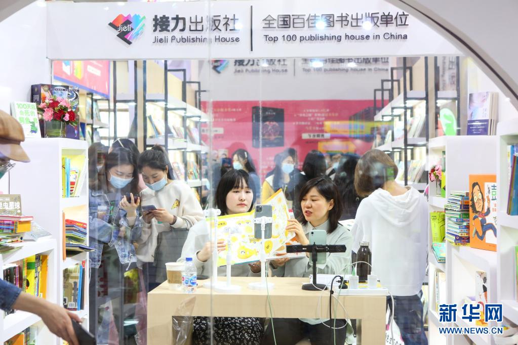 3月31日,參展人員在直播推介書籍。