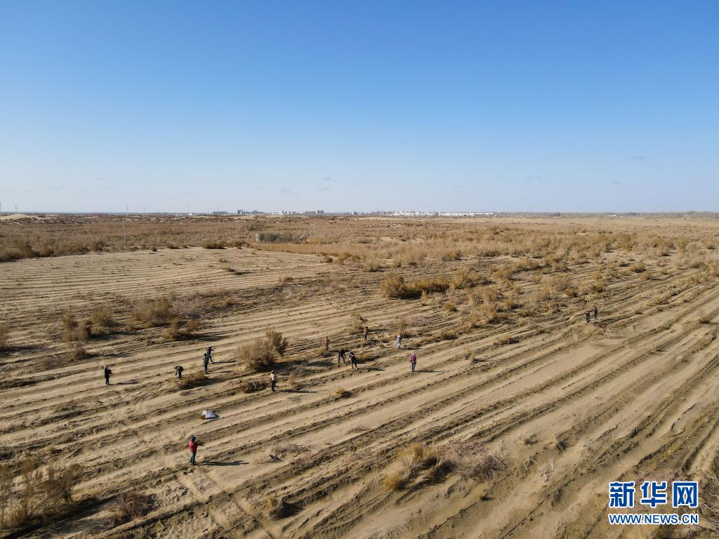 群眾在離且末縣不遠(yuǎn)的沙地里種植梭梭(4月1日攝,無人機照片)。新華社記者 高晗 攝