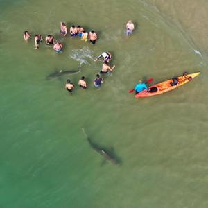 4月20日,在以色列北部城市哈代拉的海邊,鯊魚從人們身邊游過(無人機(jī)照片)。