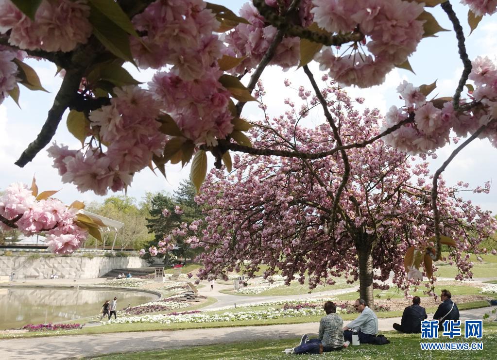 4月21日,人們在法國巴黎一處公園的櫻花樹下休閑。