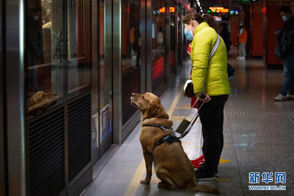 導(dǎo)盲犬“多多”陪伴祝愛葉在地鐵站內(nèi)準(zhǔn)備乘坐地鐵(3月13日攝)?! ⌒氯A社發(fā) (張夢(mèng) 攝)