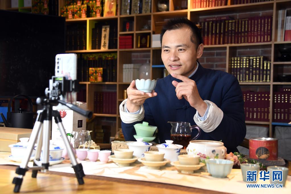 李卓澄在“小茶館”中通過(guò)視頻直播的方式向觀眾介紹茶具知識(shí)(4月29日攝)。新華社記者 任超 攝