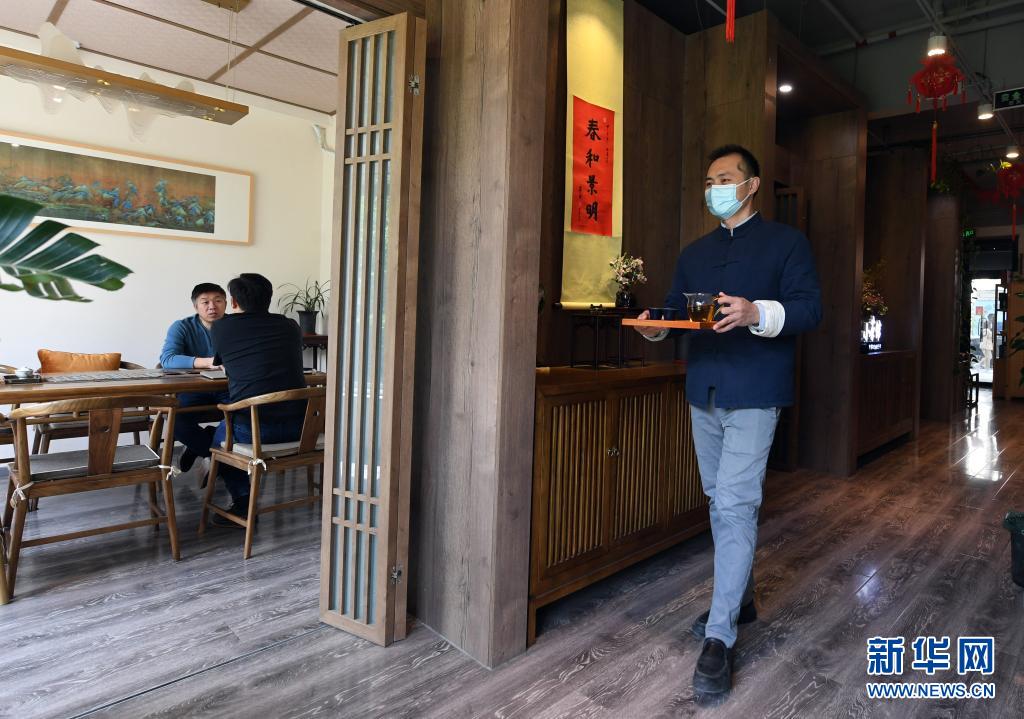 李卓澄(右一)在“小茶館”為客人上茶(4月29日攝)。新華社記者 趙婷婷 攝