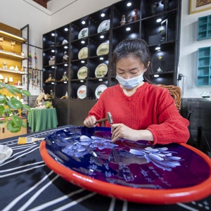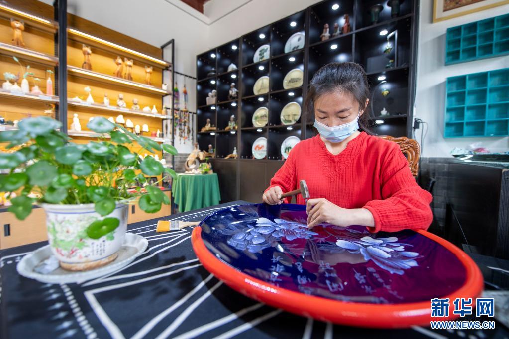 5月4日,山西省級非遺傳統(tǒng)刻瓷項目傳承人苗振潔在太原古縣城內刻瓷。