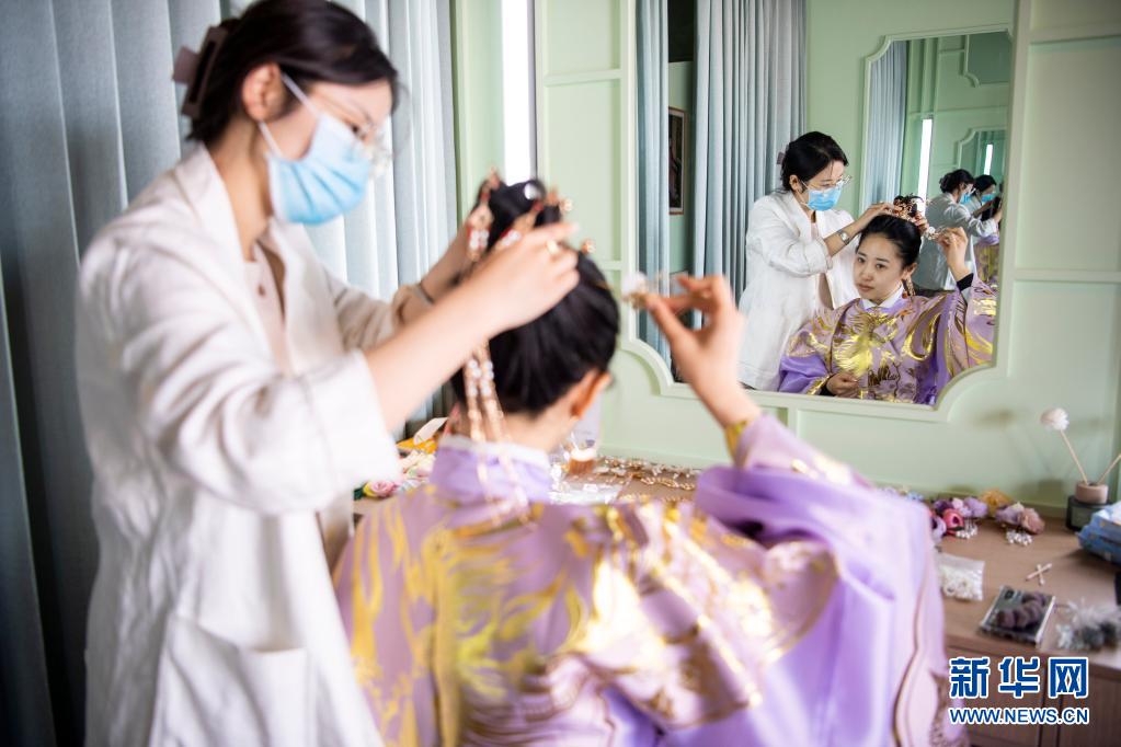 5月4日,在太原古縣城的一家店鋪內(nèi),游客化妝準備體驗古風拍攝。