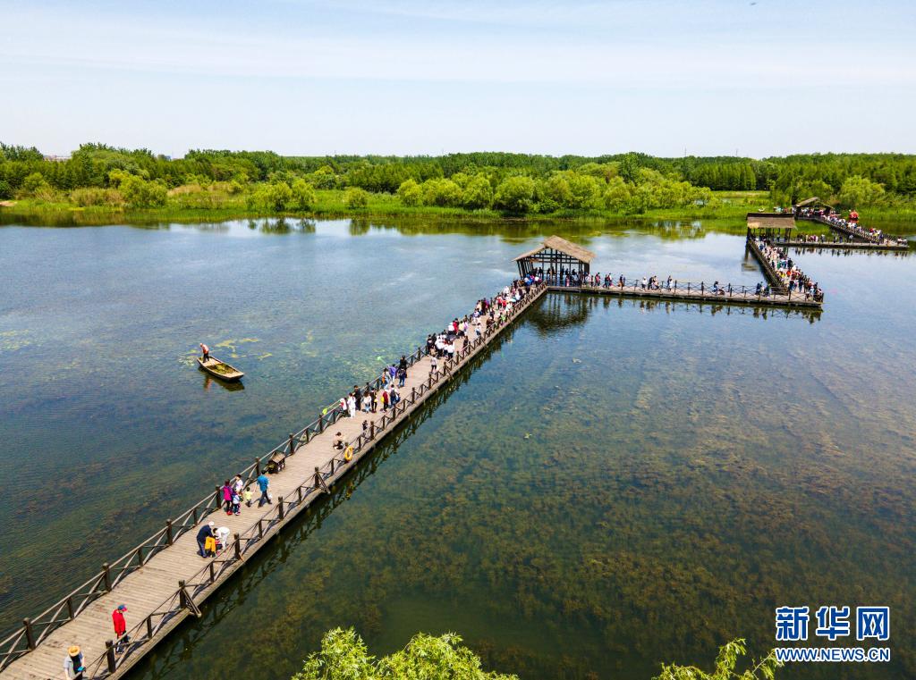 5月2日,游客在江蘇省泰州市姜堰區(qū)溱湖國家濕地公園棧道上游覽(無人機照片)。新華社發(fā)(顧繼紅 攝)