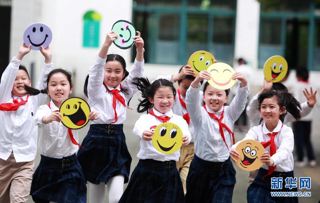5月7日,江蘇省揚(yáng)州市汶河小學(xué)的學(xué)生們?cè)凇靶τ澜缥⑿θ铡被顒?dòng)中手舉笑臉卡做游戲。世界精神衛(wèi)生組織將每年的5月8日定為“世界微笑日”,希望通過(guò)微笑促進(jìn)人類身心健康,增進(jìn)社會(huì)和諧。新華社發(fā)(孟德龍 攝)