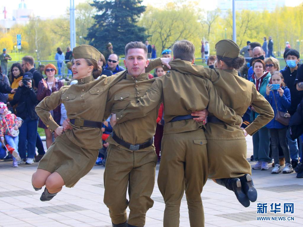 5月9日,人們?cè)诎锥砹_斯首都明斯克觀看勝利日節(jié)慶表演。