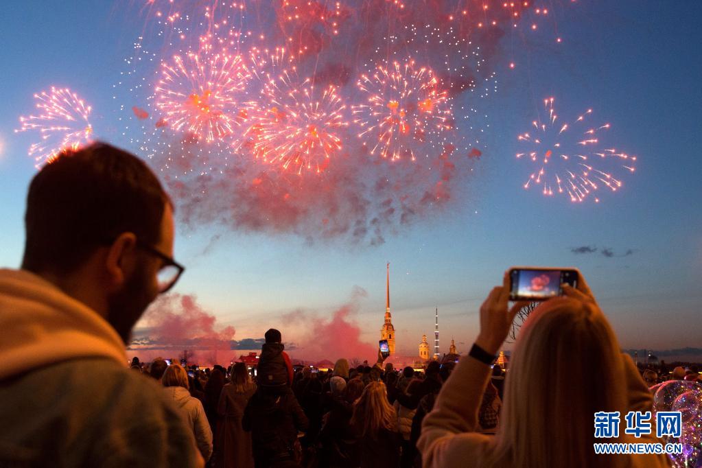 5月9日,人們?cè)诙砹_斯圣彼得堡觀看煙花。