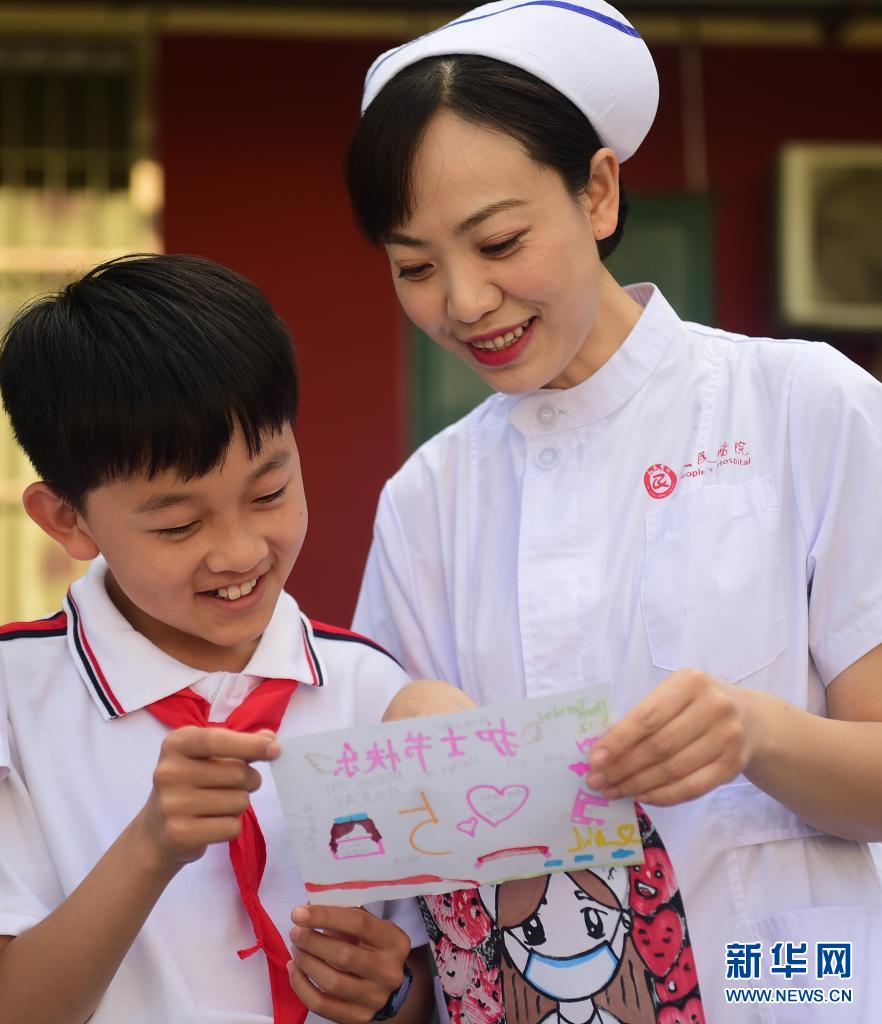5月11日,河北省滄州市新華區(qū)車站小學學生為滄州市人民醫(yī)院的護士阿姨送上美術作品,表達敬意。