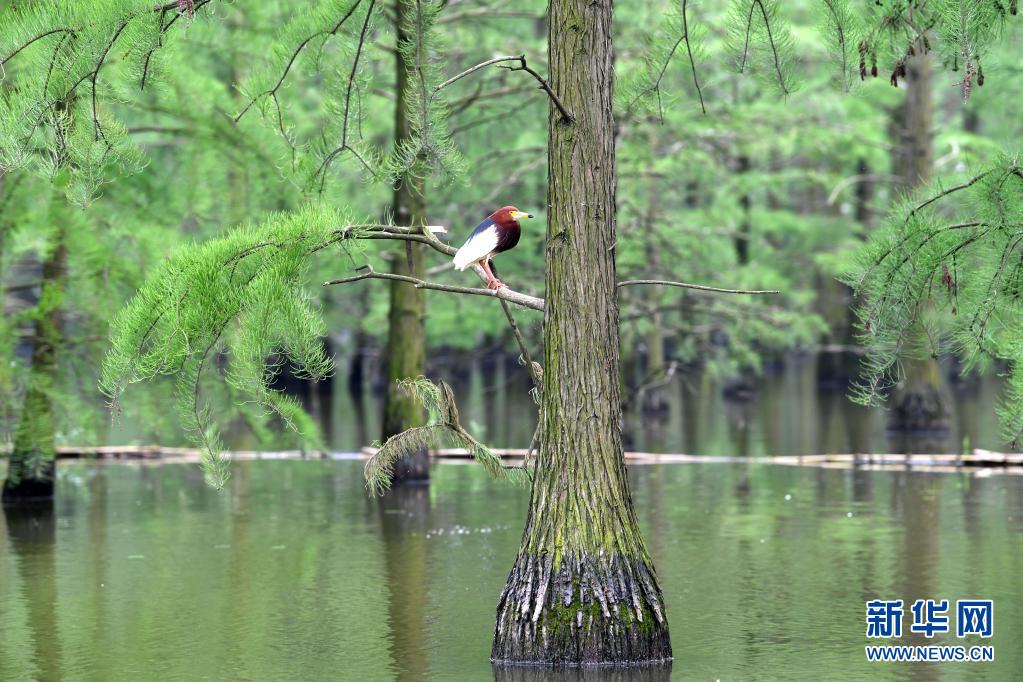 5月12日,在池杉湖國(guó)家濕地公園內(nèi),鳥兒在池杉林間休息。