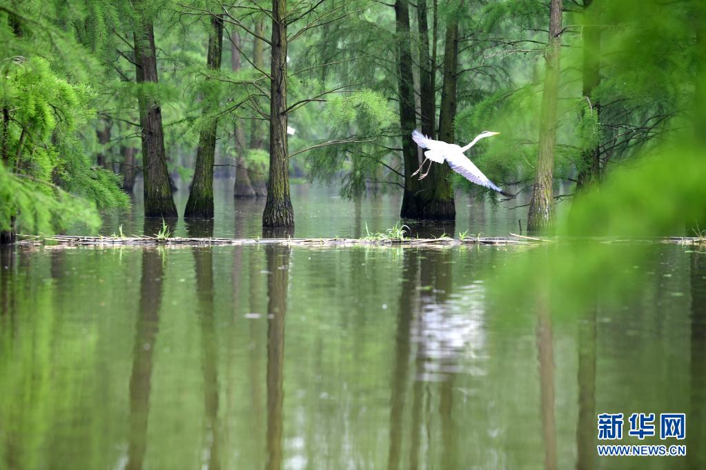 5月12日,在池杉湖國(guó)家濕地公園內(nèi),鳥兒在池杉林間飛舞。