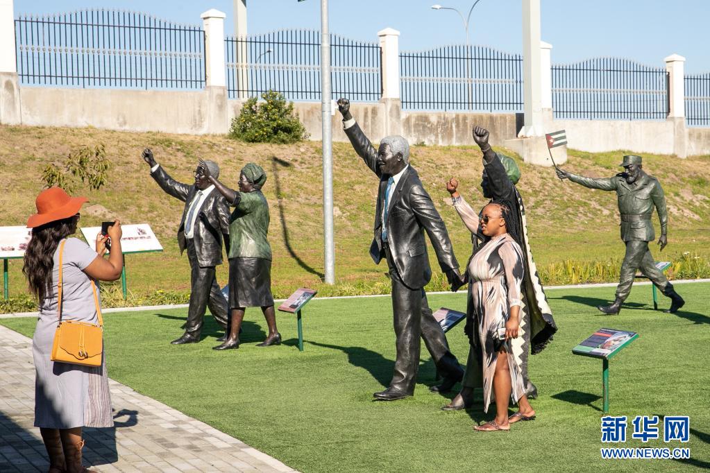 7月18日,在南非開(kāi)普敦,一名游客和南非前總統(tǒng)納爾遜·曼德拉及其夫人溫妮·馬迪基澤拉-曼德拉的銅像合影。