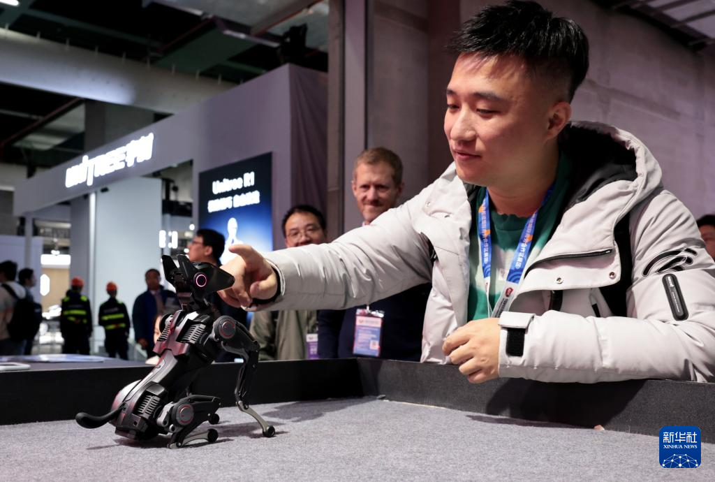 3月12日,参观者在东方枢纽展区现场与一个名叫“哮天Sirius”的公斤级可训练机器狗互动。