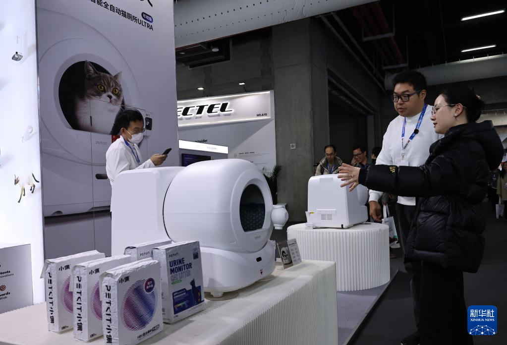 3月12日,参观者在东方枢纽展区现场一款智能猫厕所产品前交流讨论。