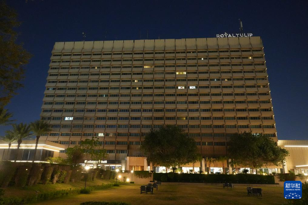 位于伊拉克首都巴格达“绿区”的拉希德酒店16日晚间遭空袭。新华社记者驻地也在此酒店内,房间震动明显,窗外出现爆炸产生的大量火光和烟尘。