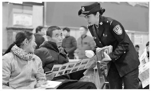 圖為警方在火車(chē)站向旅客宣講春運(yùn)安全注意事項(xiàng)。本報(bào)通訊員 張?chǎng)?方亮攝