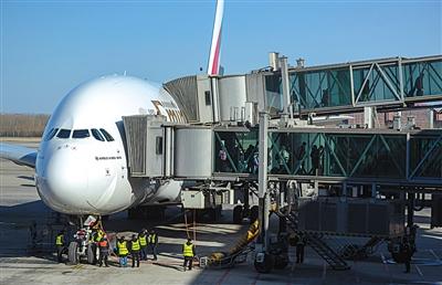 2月7日,一架飛機(jī)到達(dá)后,首都機(jī)場(chǎng)博維公司工作人員操作客梯廊橋與飛機(jī)連接后下客。圖片來源:新京報(bào)