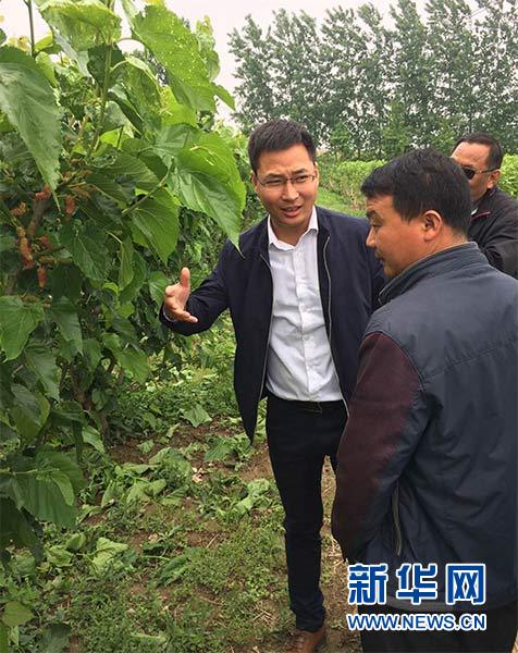 江蘇宿遷市宿城區(qū)埠子鎮(zhèn)蠶桑村黨支部書記周炳均(左)帶著村組干部、黨員和種植大戶30余人在徐州參觀果桑種植等項目(2017年5月4日攝)。新華社發(fā)