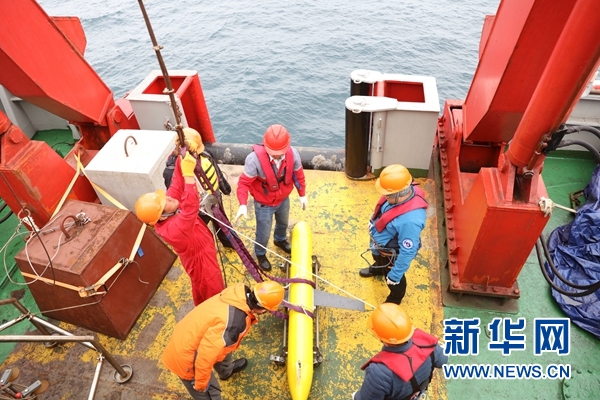 北京時(shí)間28日5時(shí)23分,考察隊(duì)隊(duì)員們將“海翼”號(hào)水下滑翔機(jī)緩緩送入海中。在成功入海后,“海翼”號(hào)開始對(duì)所在海域執(zhí)行剖面觀測(cè)。