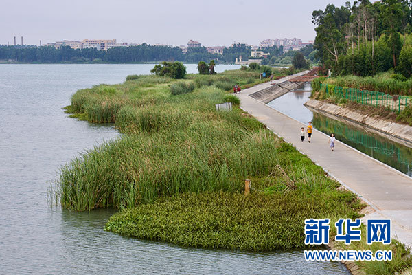 8月4日,幾位小朋友走在福建向金門(mén)供水工程取水地晉江龍湖湖畔。新華社記者 姜克紅 攝