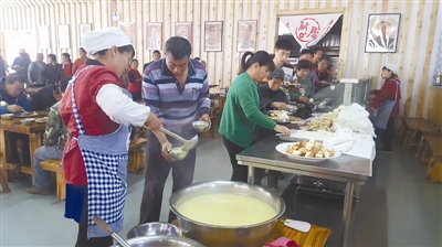 午飯時間,中郝峪村村民到大食堂免費就餐。