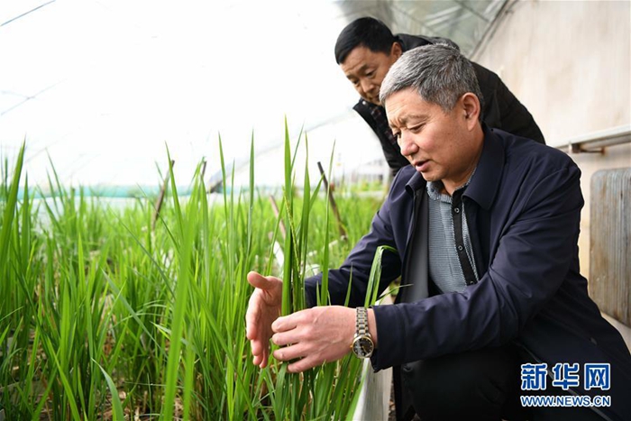 孫斌(前)在黑龍江省樺南縣水稻分子育種研發(fā)中心溫室大棚查看育種水稻長勢(2月2日攝)。新華社記者 王建威 攝