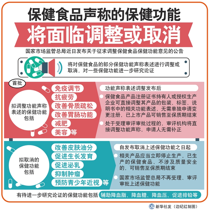 國家市場監(jiān)管總局在對不同歷史時(shí)期批準(zhǔn)的保健功能進(jìn)行梳理匯總的基礎(chǔ)上,組織醫(yī)學(xué)、藥學(xué)、食品、營養(yǎng)等領(lǐng)域?qū)<疫M(jìn)行多次論證,研究提出了調(diào)整保健功能的意見。堵塞保健食品功能聲稱被虛假宣傳的漏洞,提升消費(fèi)者對保健食品功能聲稱的科學(xué)認(rèn)知和準(zhǔn)確判定,避免與藥品疾病預(yù)防和治療作用混淆。